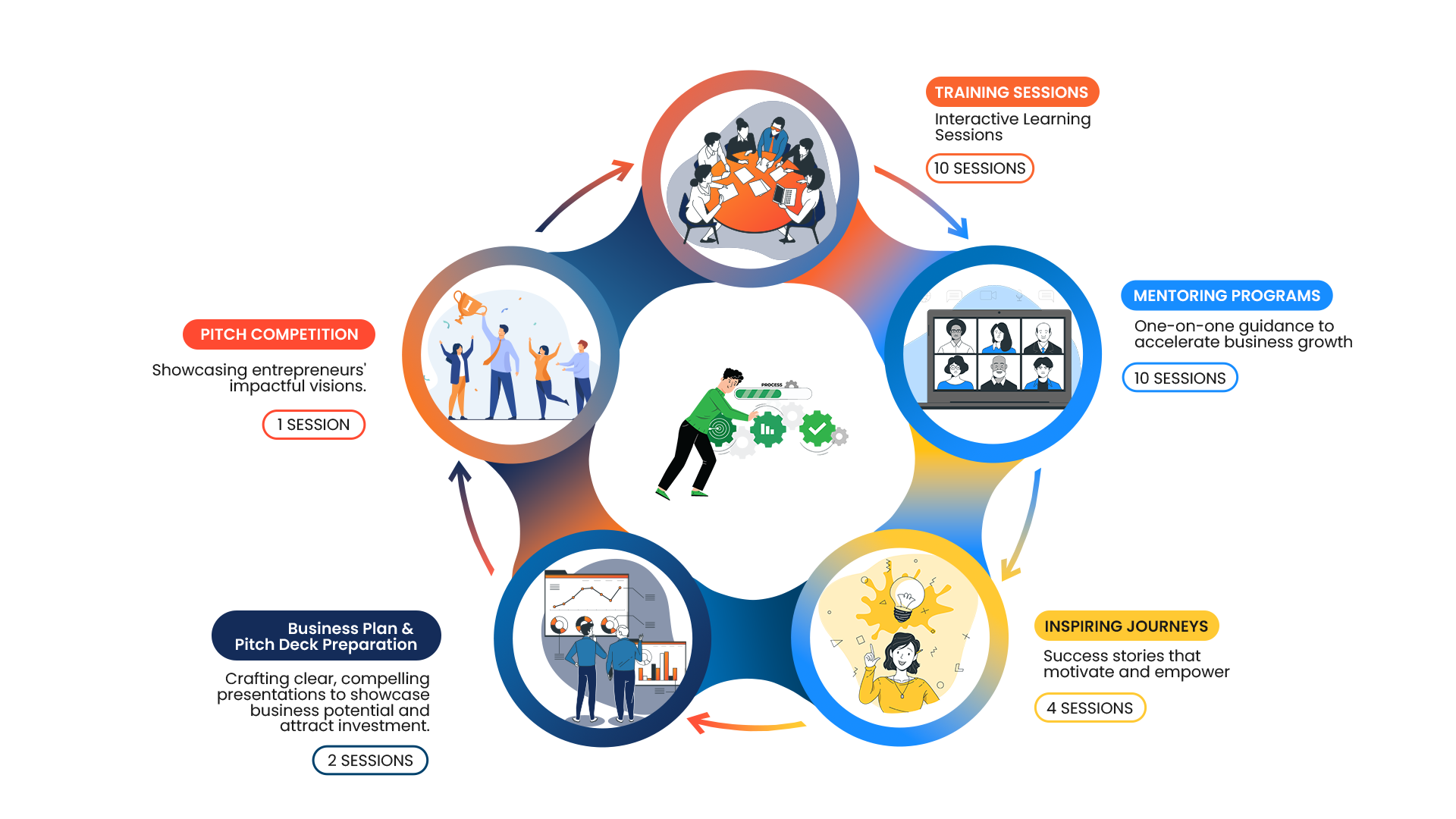 Key milestones include evaluating and innovating for business success, enhancing processes with industry best practices, mastering essential business management skills, pitching day competition, and preparing for impactful investor readiness support. As participants progress, they gain tools to build brand authority, explore global opportunities, and contribute to a thriving entrepreneurial ecosystem through mentorship and collaboration.
